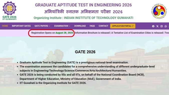 आईआईटी गुवाहाटी ने ग्रेजुएट एप्टीट्यूड टेस्ट इन इंजीनियरिंग (GATE 2026) के लिए पंजीकरण तिथियों में बदलाव किया है। पहले आवेदन प्रक्रिया 25 अगस्त 2025 से शुरू होनी थी, लेकिन अब यह 28 अगस्त 2025 से शुरू होकर 28 सितंबर 2025 तक चलेगी। वहीं, लेट फीस के साथ उम्मीदवार 9 अक्तूबर 2025 तक आवेदन कर सकेंगे। इच्छुक अभ्यर्थी आधिकारिक वेबसाइट gate2026.iitg.ac.in पर जाकर पूरी अधिसूचना देख सकते हैं।